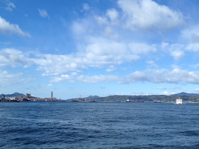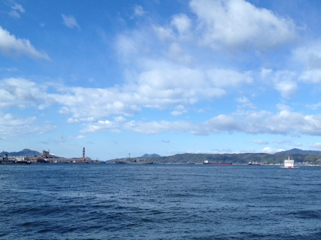 瀬戸内海のブルーが迫る呉の港。前方を航行しているのは海上自衛隊の艦船。