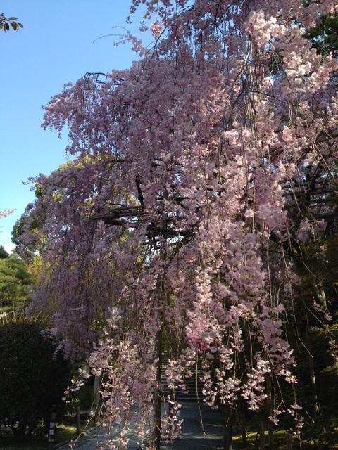 龍安寺は京都の中でも桜が遅い方だがこの時期、最も開花の遅い紅枝垂れが正に見ごろとなっていた。