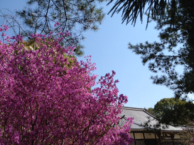 満開のミツバツツジと金堂。