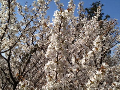 花はソメイヨシノよりも大分大きめでより白い。