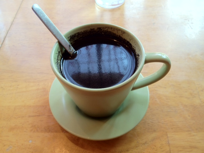 細かく挽いた豆をそのまま沈めて飲む(故に豆の味の個性というか癖がもろに出る)バリスタイルのコーヒーがランチでも味わえる。