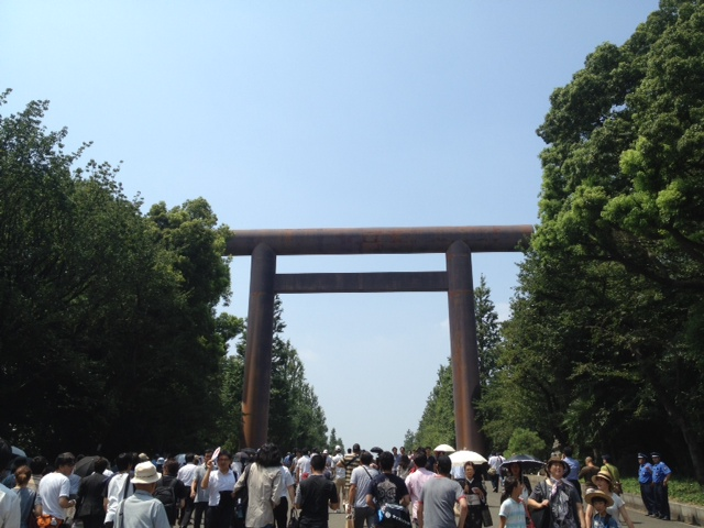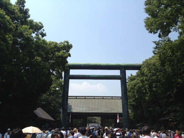 参道前ではパチスロ反対・中国政府関連のチベット・ウイグル問題・台湾の中国領表記問題等、終戦とは無関係なビラを配る団体の群れ。
