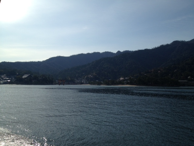 宮島口からフェリーに乗って宮島まで移動、眼前に宮島の勇壮な姿と厳島神社の海中の鳥居が見えてくる。