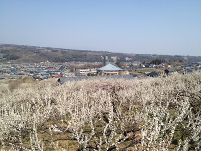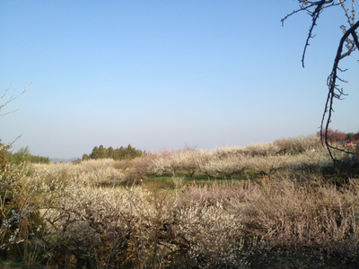 丘陵を梅林が覆い尽くし、見晴らし台から眺めると白い霞がかかったようにも見える。