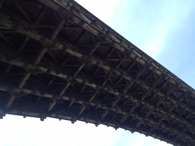 五連の木造アーチが四つの石造橋脚で支えられているという構造で世界的に見ても他に類を見ない橋のデザインといわれる。