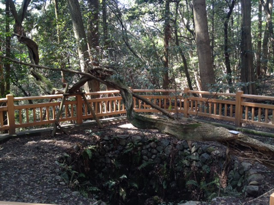 岩国城名物の古井戸。井戸の上をまたいで上方に向かって伸び、周りの木々に巻きついているこの巨大な蔓はまあ見ての通りだが「フジ」である。