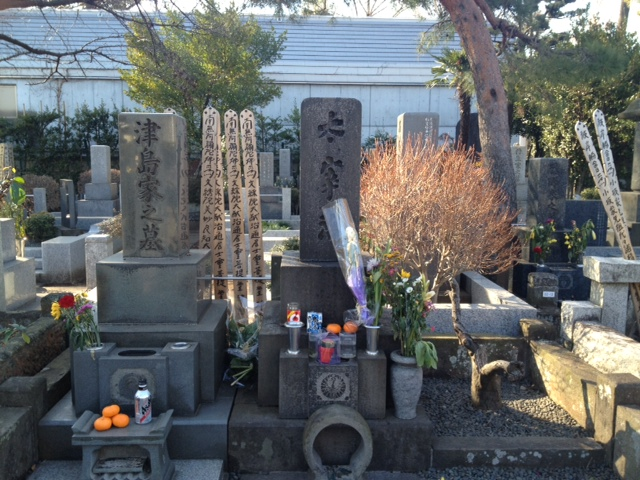 周囲には「~家之墓」と刻まれた墓石が立ち並ぶ中での「太宰治」の文字。