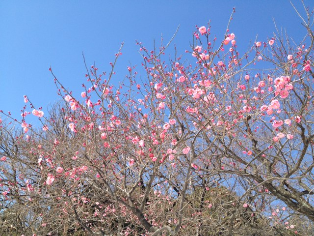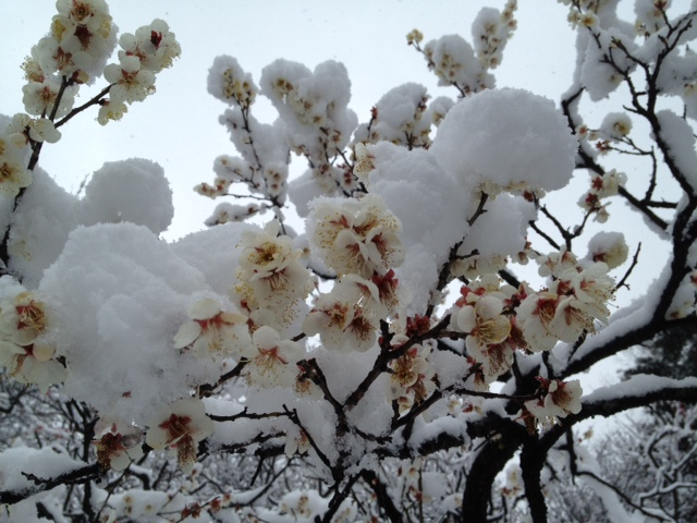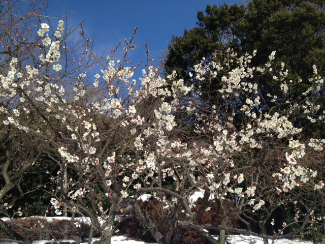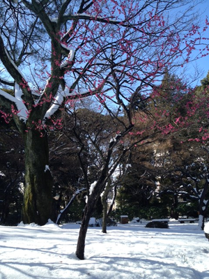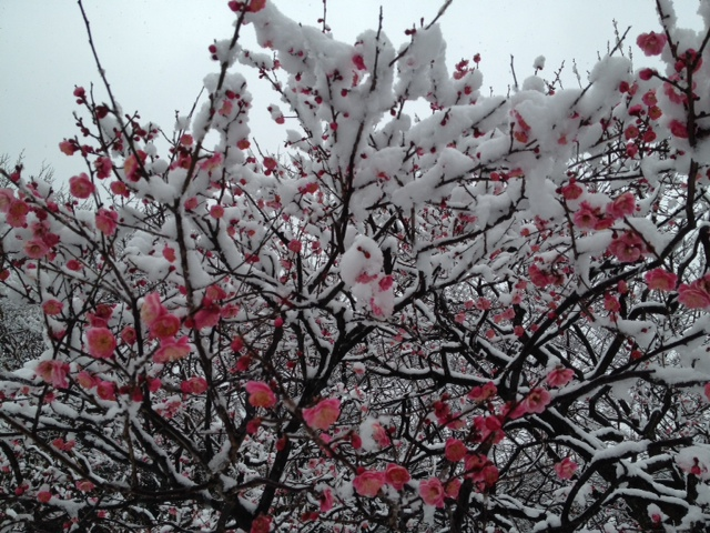 雪に映える寒紅梅。白梅はまだ殆ど咲いていない。